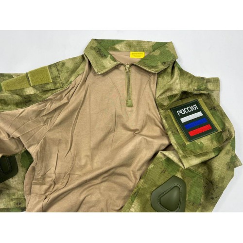 Описание: Военная боевая рубашка надевается через голову и носится в заправку, изготовлена из смесовой ткани: для туловища использована однотонная трикотажная дышащая ткань, состав которой 95% хлопок + 5% спандекс; для рукавов – камуфляжная прочная ткань, состав которой 65% полиэстер + 35% хлопок.