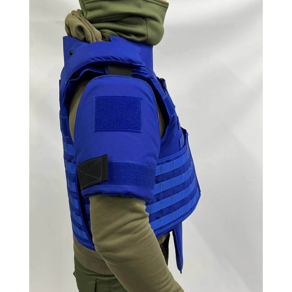 Бронежилет обеспечивает полную защиту благодаря своему баллистическому пакету, который включает переднюю, заднюю, боковую, плечевую, паховую зоны и шею. Бронеэлемент состоит из 45 слоев баллистической ткани из сверхвысокомолекулярного полиэтилена высокой плотности, обеспечивая надежную защиту от различных угроз.